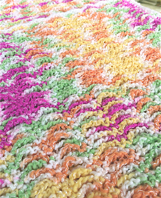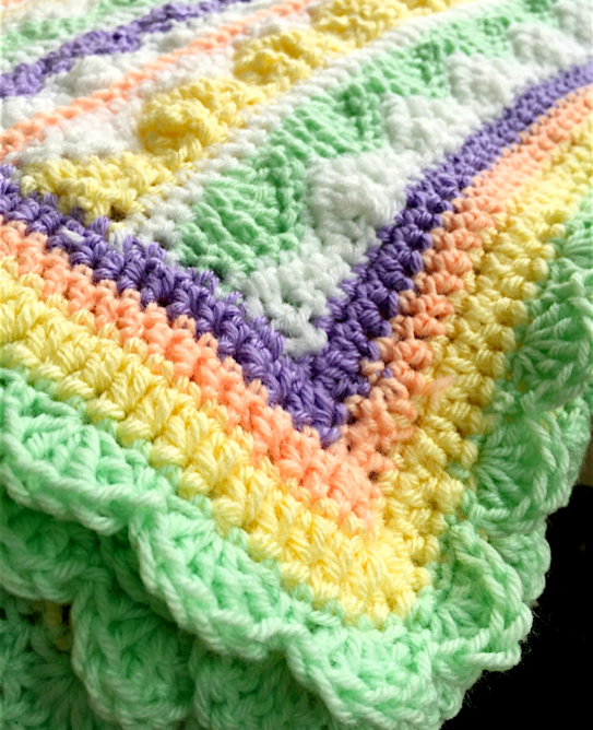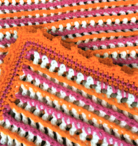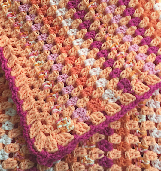 I started with a chain of 121, but the blanket was too long for a baby blanket. When I use this pattern again, I will try a chain of 100 to start. I used the Creamsicle yarn below as the main color then using up my scraps of magenta, pink, orange and white to add some color.