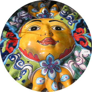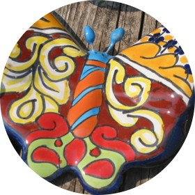 Next, I stopped in at Country Way Garden Center where hand-painted garden art called Talavera caught my eye. Originally made in Spain then brought to Mexico, this classic style of pottery adds a cheerful whimsy to any garden setting. Pieces include lizards, frogs, butterflies, turtles and suns. I was also excited to see enormous pots of the wonderful sky-blue flowering Plumbago auriculata. This tender perennial from South Africa thrives in the hot summer and is disease, pest and deer-resistant.