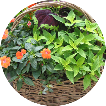 New Guinea impatiens, salvia, coleus, sedum & celosia at Green Acre Farm