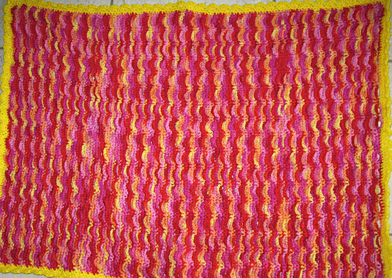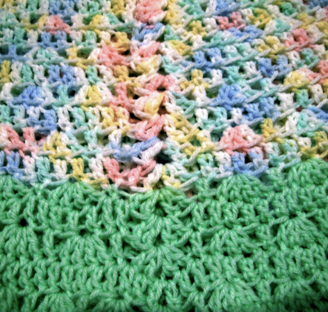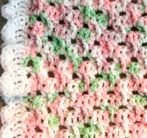 My recommendation: For Row A, I chained 110 to make a baby blanket measuring 28” across then just added an even amount of each color of rows, finally measuring 36” long. Then I added a simple border of single crochets in the flower colors and a simple scallop.