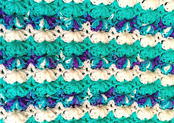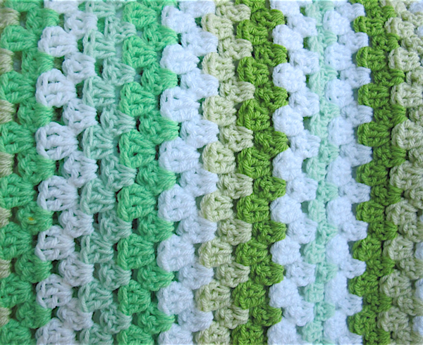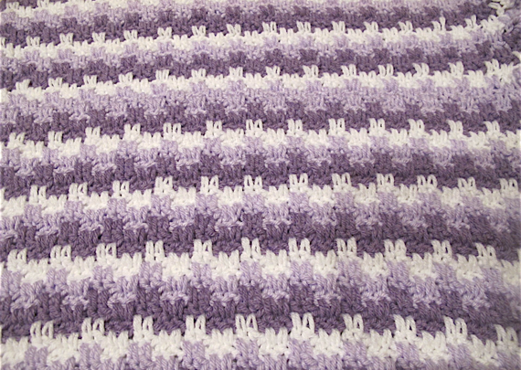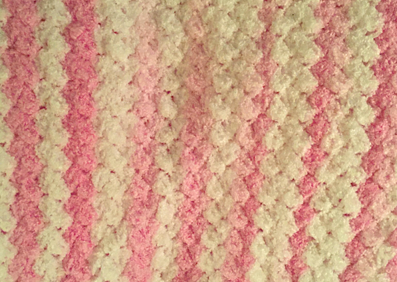 My recommendation: For Row A, I chained 110 to make a baby blanket measuring 28” across then just added an even amount of each color of rows, finally measuring 36” long. Then I added a simple border of single crochets using all three colors