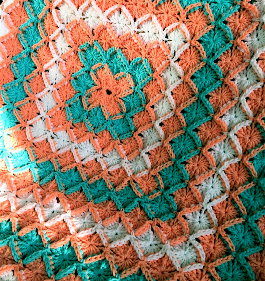 I started with a chain of 121, but the blanket was too long for a baby blanket. When I use this pattern again, I will try a chain of 100 to start. I used the Creamsicle yarn below as the main color then using up my scraps of magenta, pink, orange and white to add some color.