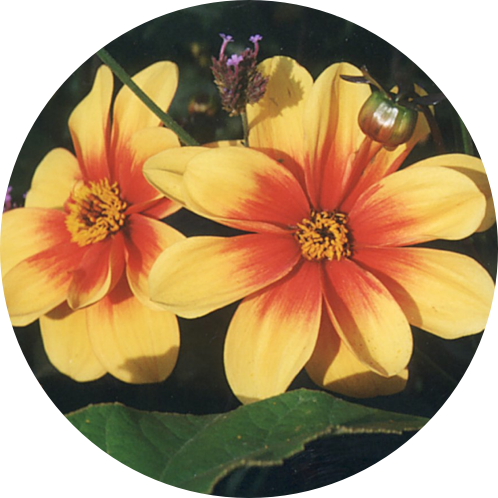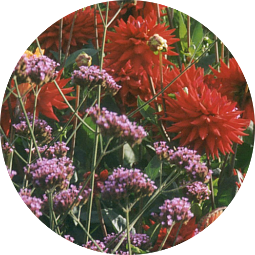 For a blast of color in late summer and fall, Christopher Lloyd infuses small flowering Dahlias, which are a herbaceous, tender perennial here in zone 5 and need to be lifted after the first frost. A few of my favorites include the dramatic D. 'Bishop of Llandaff' which has fiery red flowers and dark purple foliage. The deep rose 3" flowers of D. 'Fascination' stand out against it's purple-green foliage and look great paired with Sedum 'Matrona'. Add D. 'David Howard' to a sunny spot for an explosion of orangy-bronze excitement interplanted with the contrasting violet flowers of Verbena bonariensis. For a stunning combination, pair up the yellow and red blooms of D. 'Moonfire' with a dark-leaved canna like C. 'Indica purpurea'.