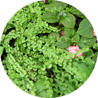 Athyrium filix-femina ‘Frizelliae’ (tatting fern) mingles with miniature hosta and colorful impatiens