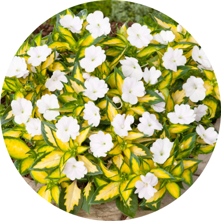 SunPatiens Spreading White is dramatic with variegated foliage. © Sakata Ornamentals