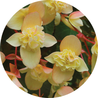 Begonias have taken the stage, front and center, with amazing trailing hybrids perfect for hanging baskets and containers. The Million Kisses series includes ‘Honeymoon’, ‘Amour’, ‘Elegance’ and ‘Devotion’ with blooms of yellow, dark red, blush pink and velvety red, respectively. Last summer, Wisley, a world-class garden in Great Britain, used award winning ‘Devotion’ extensively for their summer displays. Double blooms adorn the Bon Bon series of begonias in ‘Cherry’ or ‘Sherbet’ (pale yellow with a blush of pink). They are great performers in the garden, blooming from June through September. Bon Bon’s tolerate both hot, dry conditions and prolonged wet conditions. Self cleaning flowers are low maintenance and do not require deadheading.