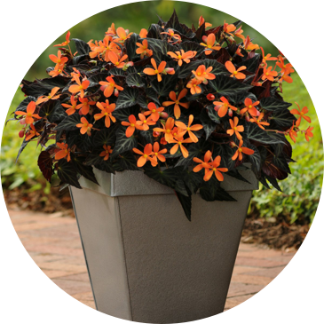 Middle: Dark bronze foliage offsets bright orange blooms on Sparks Will Fly Begonia.