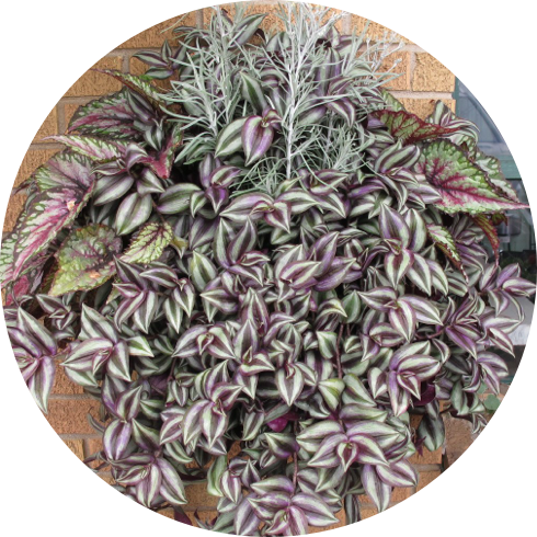 Agle’s Farm Market uses an ordinary houseplant in this stunning display. Zebrina pendula (wandering jew plant) happily climbs through Begonia rex ‘Salsa’ and Helichrysum thianschanicum ‘Icicles” in a 16” coco-lined wall basket.