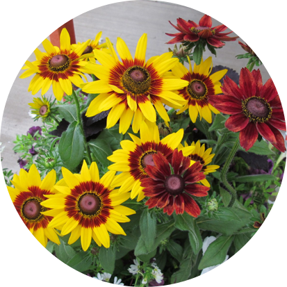 Mixed containers at Chiavetta's Potatoes & Greenhouse include vibrant rudbeckias.