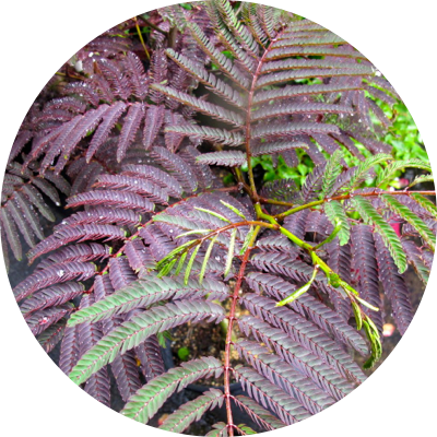 The chocolate-burgundy foliage of the Summer Chocolate Mimosa Tree at Turnbull Nursery and Garden Center.