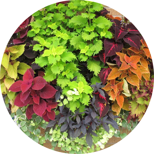 A 36” coco-lined wall trough was used to create a stunning display of coleus, sweet potato vine, licorice plant and variegated periwinkle at Agle’s Farm Market.