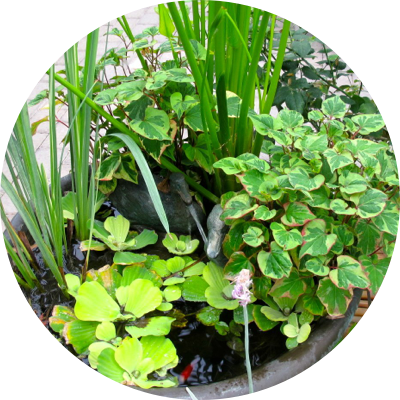 Mixed containers feature several aquatic plants at Masterson’s Garden Center & Aquatic Nursery including iris, water lettuce and Houttuynia cordata, commonly called the chameleon plant.