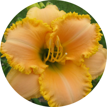 Hemerocallis ‘Cosmic Courier’ is a rebloomer with pale orange flowers outlined with gold bubble edging.