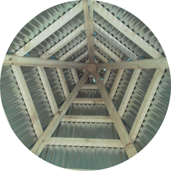 Photo, right: Inside, a timber frame supports the five-sided