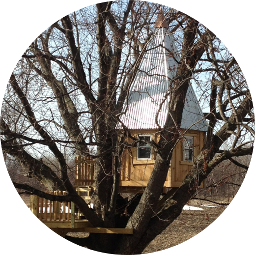Photo, above: "The Pentagon" rests amongst the branches of an Acer saccharinum (silver maple) on a farm in Kendall, New York. Inspired by surrounding barns, the base was constructed of rough sawn lumber and sits twelve feet off the ground. The corrugated steel roof rises to a towering height of twenty-eight feet. The 56 square foot interior includes fully functional windows and a trap door. A rear outside deck is perfect for enjoying the farmland views.