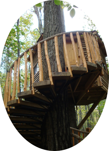 Photo, above: Created for four energetic children, the “Foursome Fort” rises eleven feet off the ground with the support of a Pinus strobus (white pine). This lodging includes a covered deck, rope ladders and custom cargo net. The slanted roof and quirky window add a whimsical touch. Inside, 70 square feet allow for ample play space. The fort-owners are located in Amherst, New York.