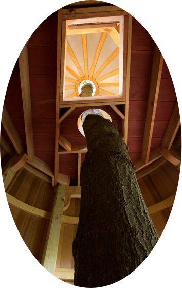Photo, above:  The “Spiral Cabin” is perched on a Populus fremontii (cottonwood). The cabin was constructed from eight hemlock logs and includes fully functional windows and doors. The interior consists of fold-out benches that convert into sleeping cots. This rustic retreat embraces 170 square feet of relaxation space.