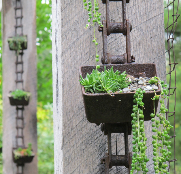 Closer to home, impressive, floor-to-ceiling green walls climb upward in the conservatory at Longwood Gardens near Philadelphia. Packed with ferns, spider plants, grape ivy, philodendron and moss, the fourteen foot walls feature ethereal textures and shapes. Situated in the Atlanta Botanical Garden, an herb wall complements an outdoor kitchen where the city’s noted chefs provide cooking classes during the summer. At Chanticleer, a pleasure garden in Wayne, Pennsylvania, rusty chains spilling with succulents hang in the “ruin garden”. According to Fran DiMarco, administrative assistant at Chanticleer, “We salvaged this hardware from a church being demolished on North Broad Street in Philadelphia, 17 or 18 years ago. It actually predates the ruin garden which was constructed in 2000. The chain and cups were on a continuous loop bringing coal from the coal bins to feed the church furnace.” So gather inspiration from near or far to design your own vertical garden. Probe nurseries and online sources for uncommon vegetation. Use found items or engineered components. Have fun!