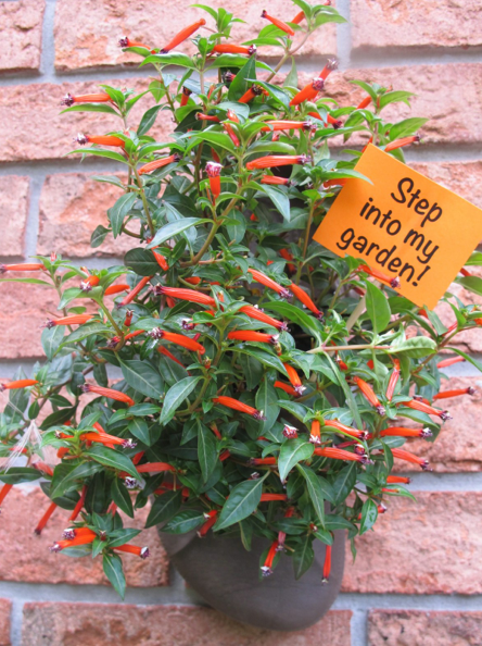 A recycled, hanging croc welcomes visitors with cascading cuphea.